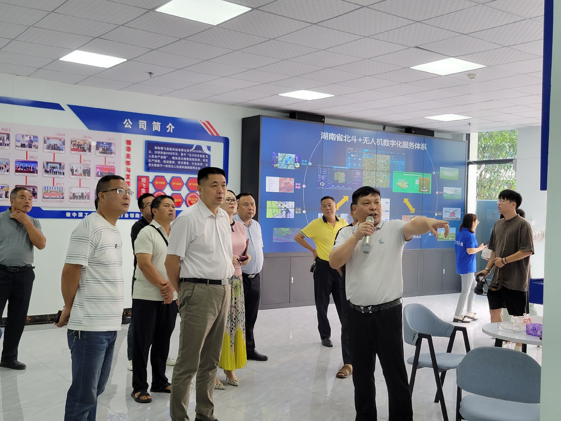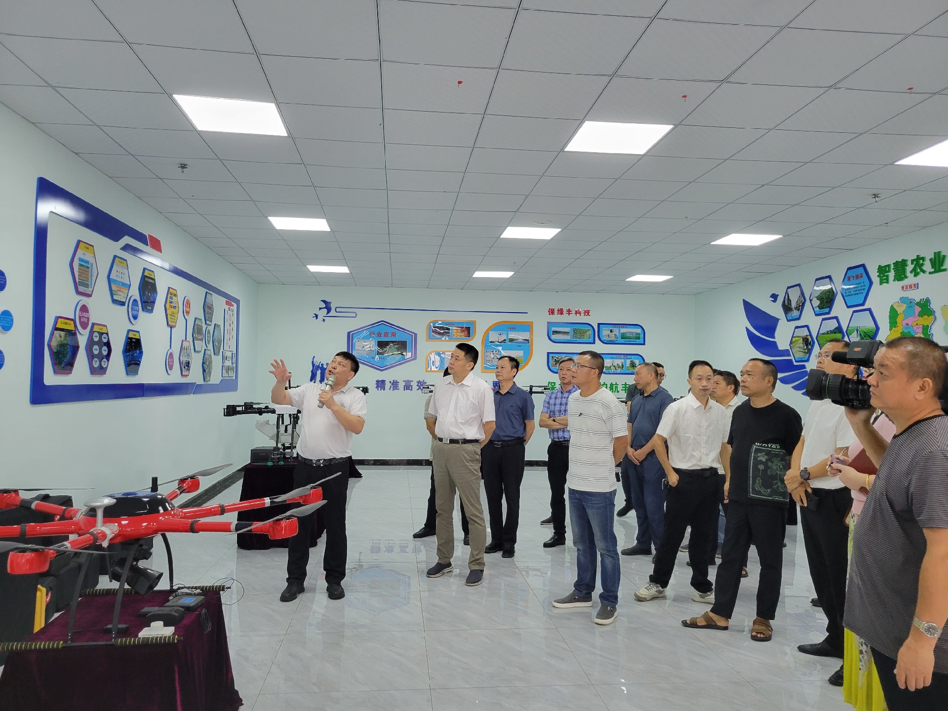 在精飛智能展廳,精飛集團董事長龍永堅向調(diào)研組一行匯報了企業(yè)生產(chǎn)經(jīng)營、技術(shù)研發(fā)、產(chǎn)品銷售等情況,其中重點講解了無人機數(shù)字農(nóng)業(yè)服務(wù)應(yīng)用示范建設(shè)項目及自主開發(fā)的全國首個“北斗+無人機數(shù)字農(nóng)業(yè)綜合應(yīng)用與公共服務(wù)”平臺運營情況。