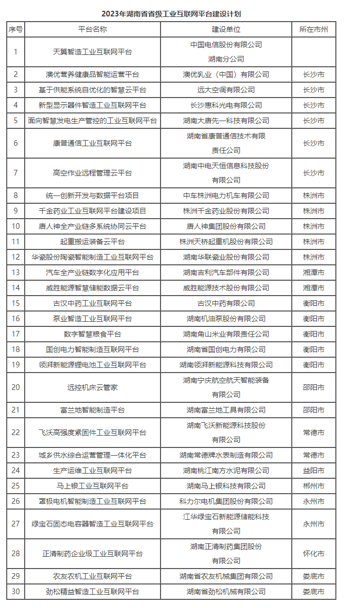 為深入開展“智賦萬企”行動,持續(xù)建設(shè)省級工業(yè)互聯(lián)網(wǎng)平臺體系,加快企業(yè)數(shù)字化轉(zhuǎn)型,打造國家重要先進制造業(yè)高地,經(jīng)企業(yè)申報、市州推薦、現(xiàn)場答辯、專家評審等程序,省工信廳同意天翼智造工業(yè)互聯(lián)網(wǎng)平臺等30個項目列入2023年湖南省省級工業(yè)互聯(lián)網(wǎng)平臺建設(shè)計劃,現(xiàn)予發(fā)布。